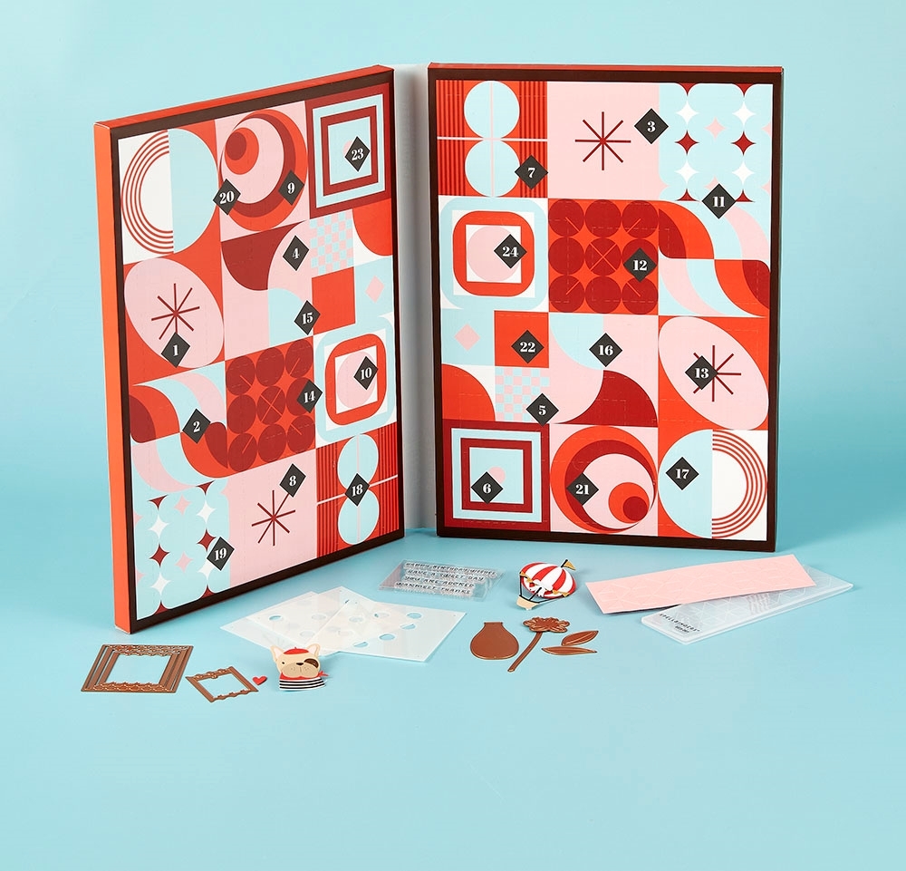 Το advent μετράει αντίστροφα από την 1η Δεκεμβρίου ως τις 24 και κάθε πορτάκι περιέχει μία μικρή crafting έκπληξη: όμορφες διάφανες σφραγίδες, μήτρες κοπής, embossing folder strips ακόμα και sequins!