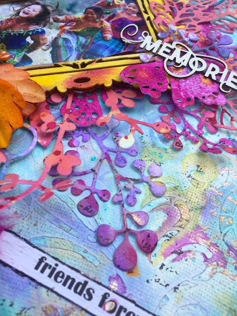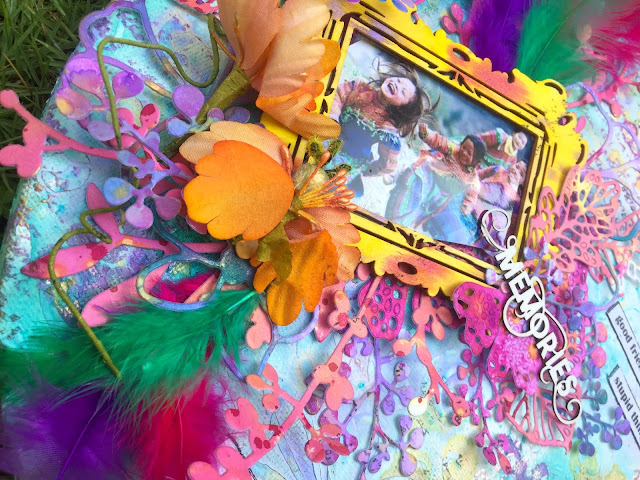 We then used these to die cut various elements for our layers. We chose a picture and a chipboard frame for it. We colored the frame with the same sprays. Next, we mounted the picture on corrugated sheet for depth and played around with all our die cut elements around it. We also added a few Prima flowers and feathers.