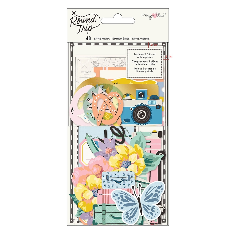 40 διακοσμητικά cardstock εφέμερα από τη συλλογή Round Trip που έχει σχεδιάσει η Maggie Holmes για την American Crafts. Εικόνες με αεροπλάνα, βαλίτσες, λεωφορεία, ποδήλατα, λουλούδια, φωτογραφικές μηχανές, quotes και άλλα.