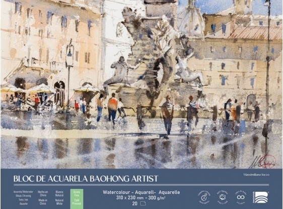 Η ποιότητα του βαμβακερού χαρτιού Baohong το έχει κάνει ιδιαίτερα αγαπητό σε όσους δουλεύουν συστηματικά με ακουαρέλα. Το χρώμα απλώνεται όμορφα, διατηρεί καθαρότητα και ανταποκρίνεται πολύ καλά σε διαφορετικούς τρόπους δουλειάς. Είναι κατάλληλο για ακουαρέλα, τέμπερες, μελάνι, ακρυλικά και gouache, ενώ το ότι είναι acid-free βοηθά το έργο να διατηρείται καλύτερα στον χρόνο. Το εξώφυλλο του μπλοκ περιλαμβάνει αποκλειστικό έργο του Massimiliano Locco, προσθέτοντας έναν ακόμη πιο ιδιαίτερο χαρακτήρα στην έκδοση.