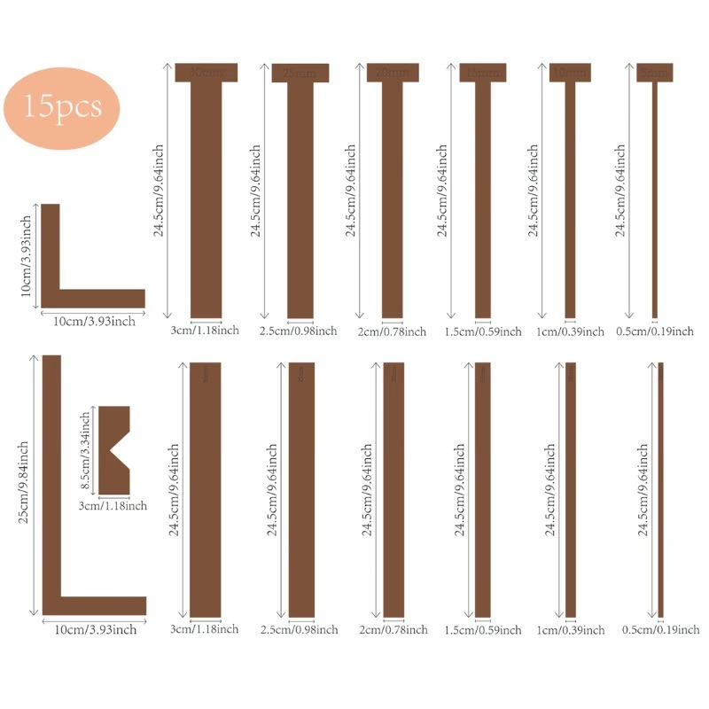 Το σετ περιλαμβάνει 15 οδηγούς αποστάσεων σε διαφορετικά πλάτη, ώστε να μπορείς να επιλέγεις κάθε φορά το μέγεθος που ταιριάζει στο project σου. Χρησιμοποιούνται για να ευθυγραμμίζεις σωστά τα διαφορετικά μέρη της κατασκευής σου και να δημιουργείς τα σωστά κενά μεταξύ τους, ώστε το βιβλίο σου να ανοιγοκλείνει απρόσκοπτα.