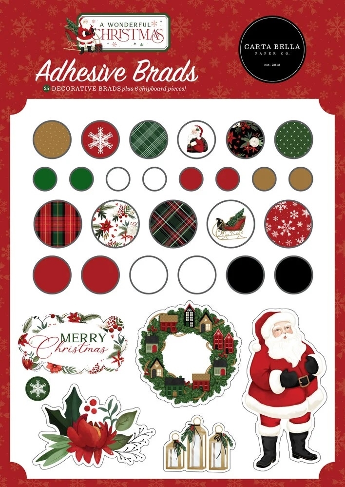 👉Στη συσκευασία θα βρείτε 25 διακοσμητικά αυτοκόλλητα brads και 6 chipboard κομμάτια με θέμα τα Χριστούγεννα.
