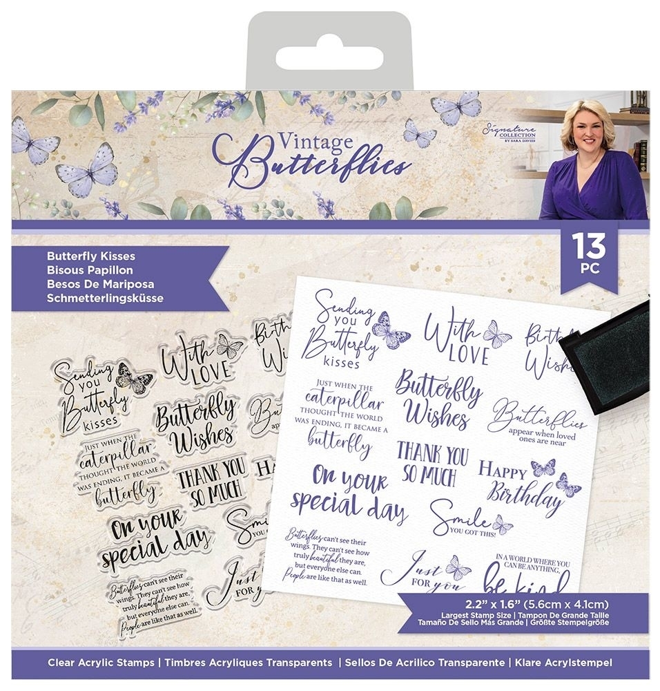 13 διάφανες σφραγίδες, έτοιμες για χρήση με ακρυλικό μπλοκ, από τη συλλογή Vintage Butterflies της Sara Davies και της Crafter's Companion με sentiments και ευχές για κάθε περίσταση.