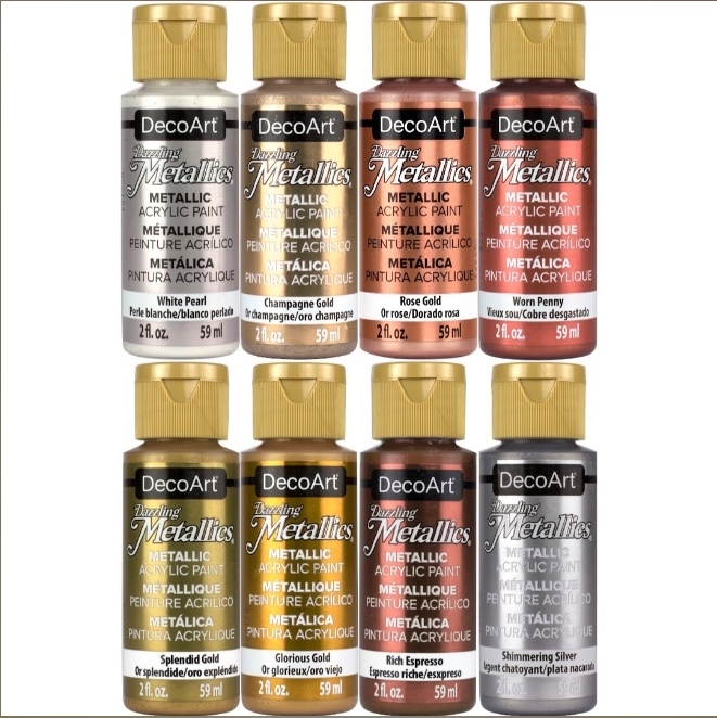 Η DecoArt διαθέτει περισσότερες από μία σειρές μεταλλικών ακρυλικών χρωμάτων. Κάθε σειρά έχει διαφορετικό βαθμό λάμψης, οπτική συμπεριφορά και στόχο χρήσης. Η επιλογή εξαρτάται από το πόσο έντονο θέλεις να είναι το μεταλλικό αποτέλεσμα.