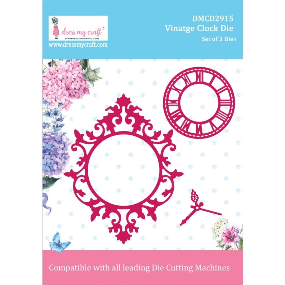 3 μεταλλικές μήτρες κοπής από την Dress My Craft. Με εικόνες από το περίγραμμα, τους δείκτες και το εσωτερικό ενός vintage ρολογιού.
