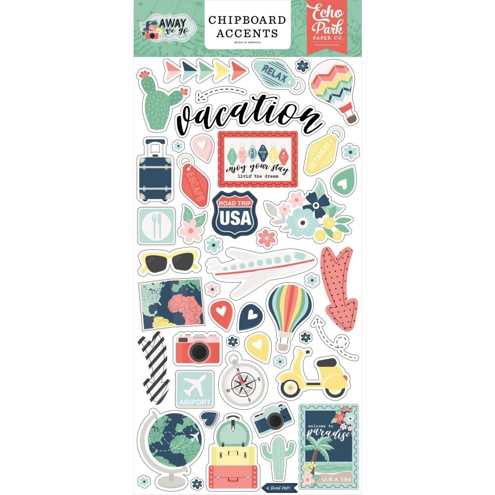 25 διακοσμητικά chipboard από τη συλλογή Away We Go της Echo Park. Εικόνες με υδρόγειους, λουλούδια, αερόστατα, quotes και άλλα