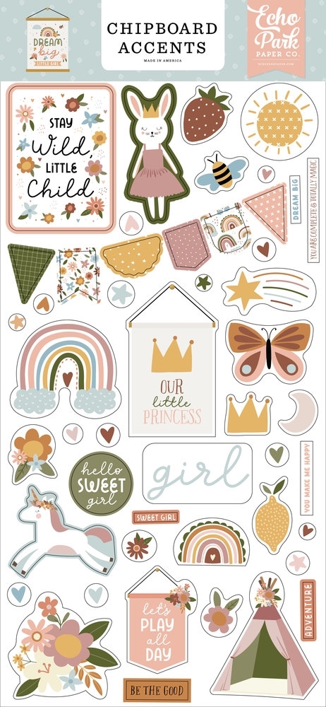 Η συλλογή Dream Big Little Girl της Echo Park είναι αφιερωμένη σε όλα εκείνα τα μικρά θηλυκά... τερατάκια που έχουν κλέψει τις καρδιές μας ανεπιστρεπτί! Σε παστέλ αποχρώσεις του ροζ, πολύχρωμα ζωάκια, μωρουδιακά και τρυφερά sentiments συνθέτουν την πιο μοναδική ιστορία για υπέροχα κοριτσάκια!