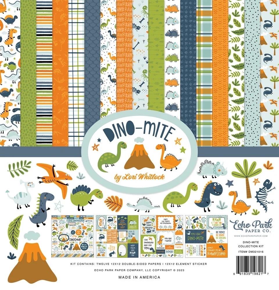 H Lori Whitlock σχεδιάζει τη συλλογή Dino-Mite για την Echo Park και το αποτέλεσμα είναι παιχνιδιάρικα… εκρηκτικό! Η Lori προσκαλεί τους απανταχού λάτρεις των δεινοσαύρων σε μια προϊστορική περιπέτεια που δεν έχει ηλικία: αξιολάτρευτοι T-Rex, φιλικοί τρικεράτωπες, πτεροδάκτυλοι και στεγόσαυροι παρελαύνουν σε ένα χαρούμενο σκηνικό στις αποχρώσεις του μπλε, του πορτοκαλί και του πράσινου.