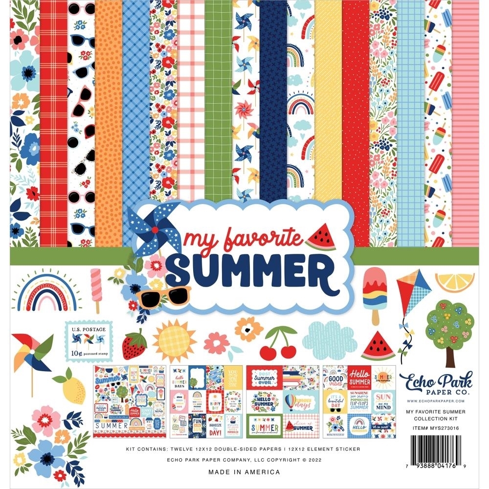12 φύλλα scrapbooking διπλής όψεως σε διαφορετικά σχέδια και 1 φύλλο με element αυτοκόλλητα από τη συλλογή My Favorite Summer της Echo Park με εικόνες με ανεμούρια, χαρταετούς, λουλούδια, παγωτά, ουράνια τόξα, γυαλιά ηλίου, quotes και άλλα.