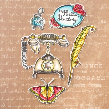 👉 H συσκευασία περιλαμβάνει 5 διάφανες σφραγίδες με ένα vintage τηλέφωνο, ένα μελάνι, μια πεταλούδα, ένα κοντηλογράφο και ένα πλαίσιο.