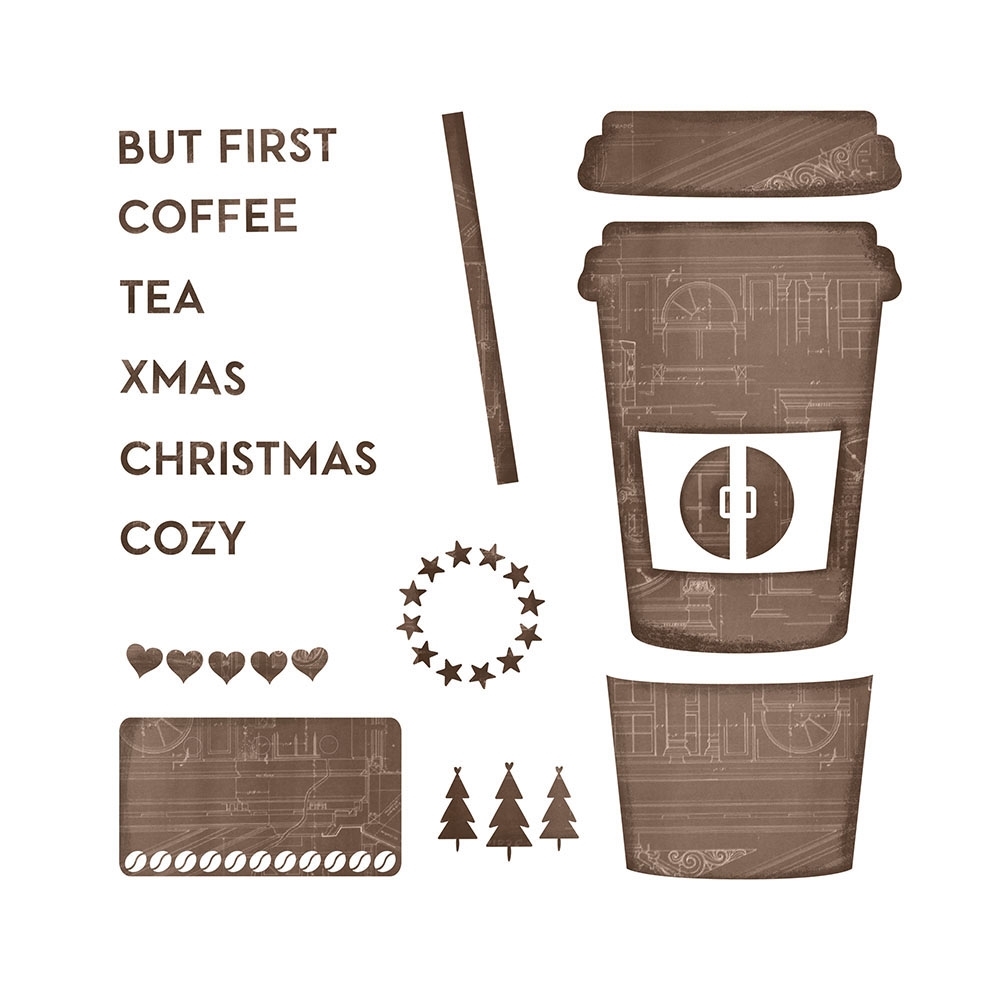 Τα dies σχηματίζουν ένα ποτήρι take away με βάση, καπάκι και καλαμάκι, τα διακοσμητικά του και τις λέξεις But first, Tea, Coffee, Christmas, Cozy και Xmas που μπορούν να συνδυαστούν φτιάχνοντας διαφορετικά sentiments.