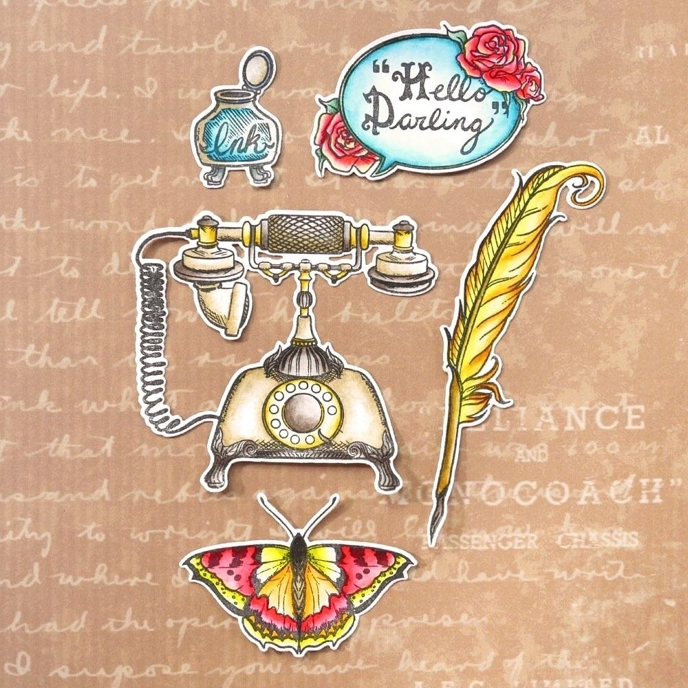 👉 Η συσκευασία περιέχει 5 μεταλλικές μήτρες κοπής με το περίγραμμα ενός vintage τηλέφωνου, ενός κοντυλογράφου, μιας πεταλούδας, ενός μελανιού και ενός πλαισίου.