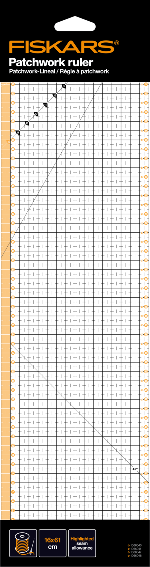 Ο Fiskars Patchwork Ruler 15 x 60 cm είναι ένας χάρακας γενικής χρήσης ακριβείας, κατάλληλος για κάθε δημιουργό που δουλεύει με χαρτί, ύφασμα ή μεικτά υλικά. Το μεγάλο μήκος και η διαφανής κατασκευή επιτρέπουν ακριβή τοποθέτηση πάνω στο υλικό, ενώ το καθαρό grid και οι σημειωμένες γωνίες 30°, 45° και 60° διευκολύνουν μετρήσεις, ευθυγραμμίσεις και κοπές.