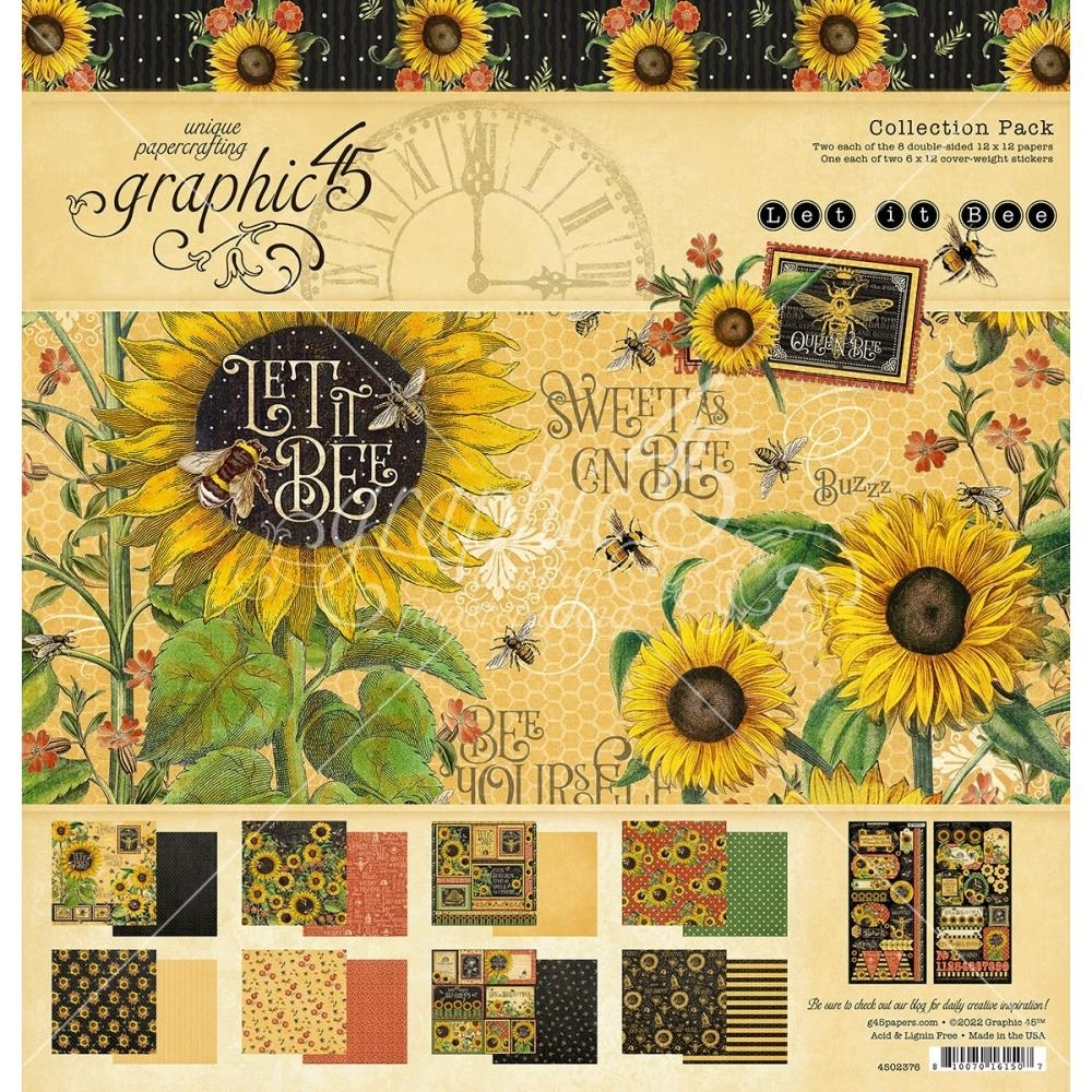 Συλλογή Χαρτιών Scrapbooking Διπλής Όψης από την Let It Bee Collection της Graphic 45. 16 φύλλα scrapbooking διπλής όψης (σε 8 σχέδια, 2 από το καθένα) και 2 cardstock φύλλα με αυτοκόλητα. Εικόνες με ηλίανθους, μέλισσες, κυψέλες, quotes και άλλα.