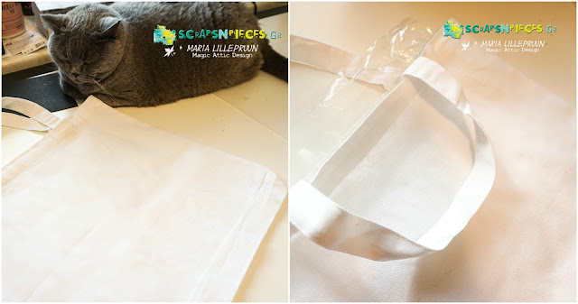 The bag, my assistant and me ready to start! First of all I put some plastic inside the bag to prevent my paints from leaking to its back side.