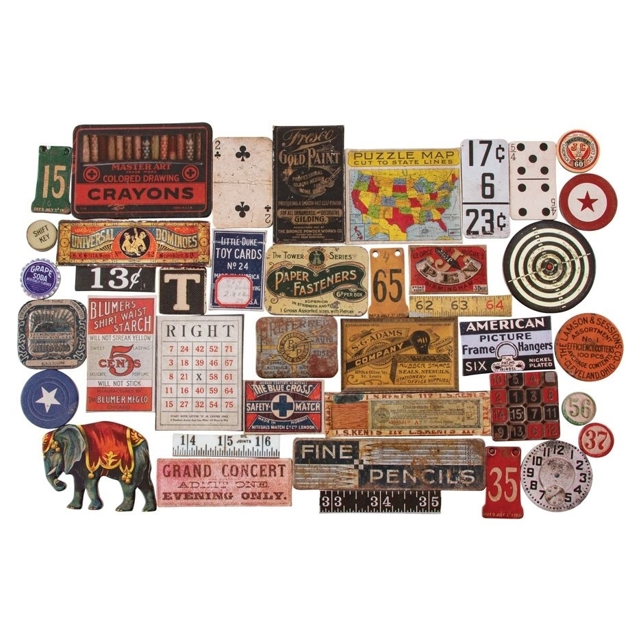 Στη συσκευασία θα βρείτε 40 διακοσμητικά που περιλαμβάνουν τραπουλόχαρτα, χάρτες, μεζούρες και πολλά άλλα με το χαρακτηριστικό ύφος του Tim Holtz.