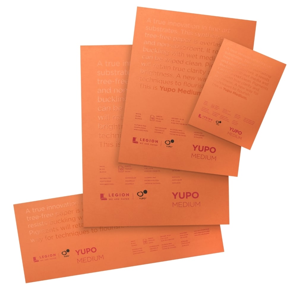 Το Yupo είναι μια λεία, μη πορώδης συνθετική επιφάνεια από πολυπροπυλένιο, σχεδιασμένη ώστε τα υλικά να παραμένουν στην επιφάνεια και να αλληλεπιδρούν μεταξύ τους. Αντί να απορροφά το χρώμα, το Yupo επιτρέπει την κίνηση, την επαναδιαμόρφωση και την επεξεργασία του αποτελέσματος σε βάθος χρόνου. Αυτό το χαρακτηριστικό καθορίζει πλήρως τον τρόπο δουλειάς και το καθιστά ιδανικό για υγρά και πειραματικά μέσα.