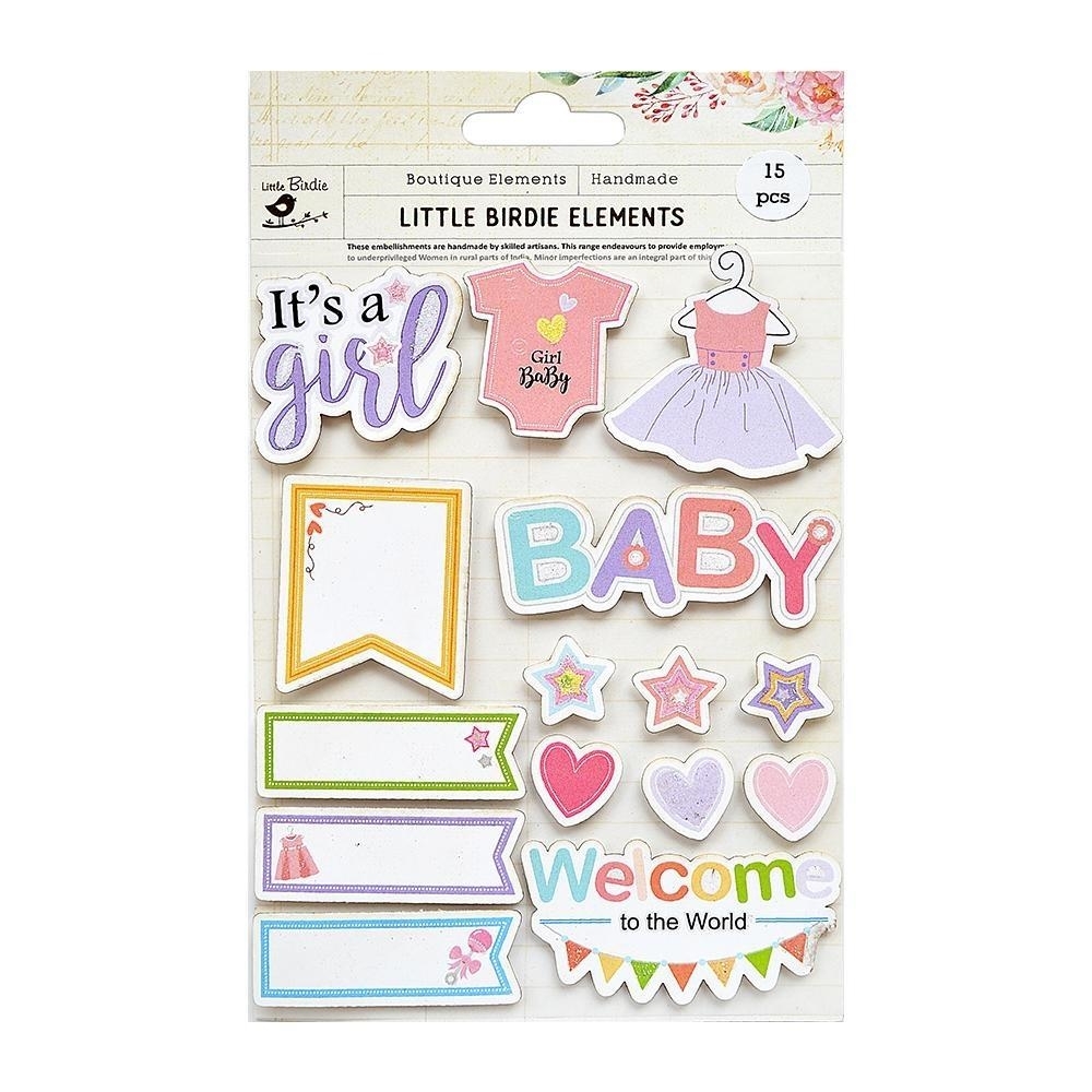 👉 Η συσκευασία περιέχει 15 αυτοκόλλητα. Εικόνες με μωρουδιακά, καρδούλες, αστεράκια, banners και sentiments για κοροτσάκια.