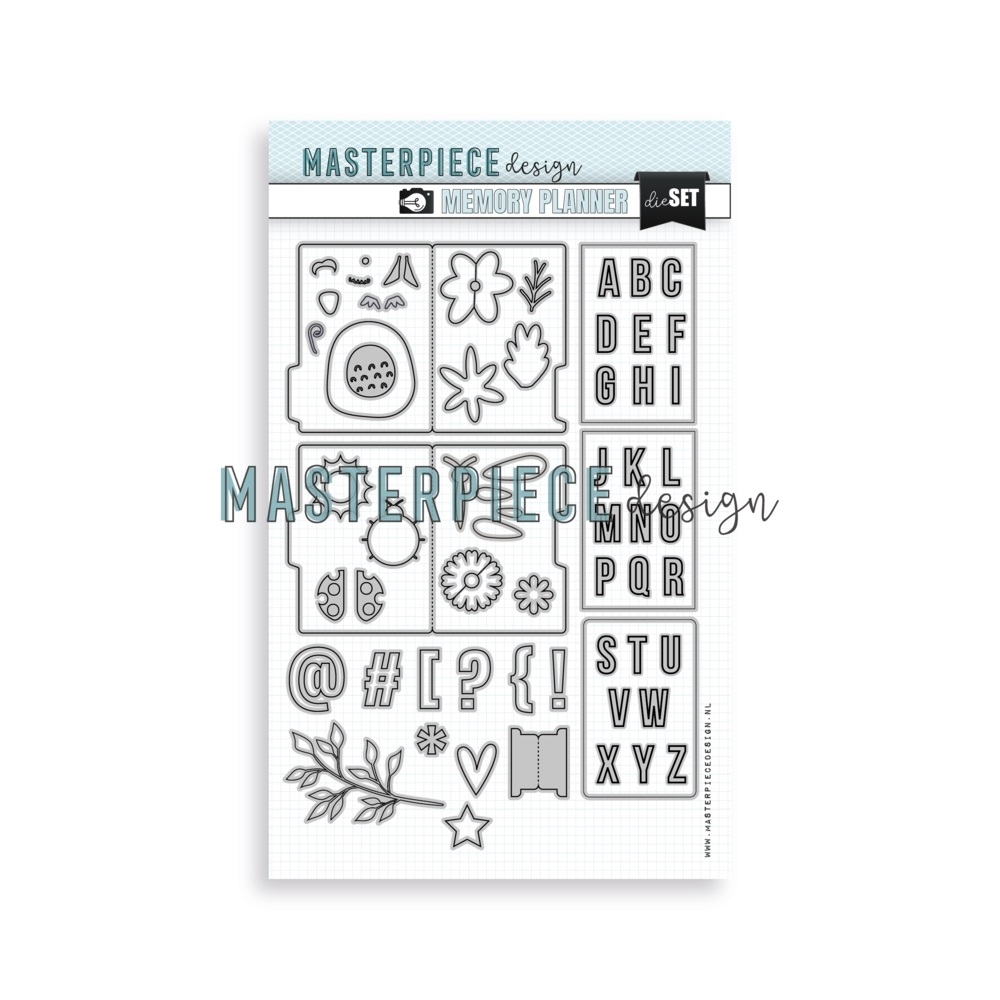 Σετ με 67 μήτρες κοπής από τη σειρά Memory Planner της Masterpiece Design. Με πλαίσια, κεφαλαία λατινικά γράμματα, σημεία στίξης, καρδούλες, λουλούδια, φύλλα και άλλα διακοσμητικά.