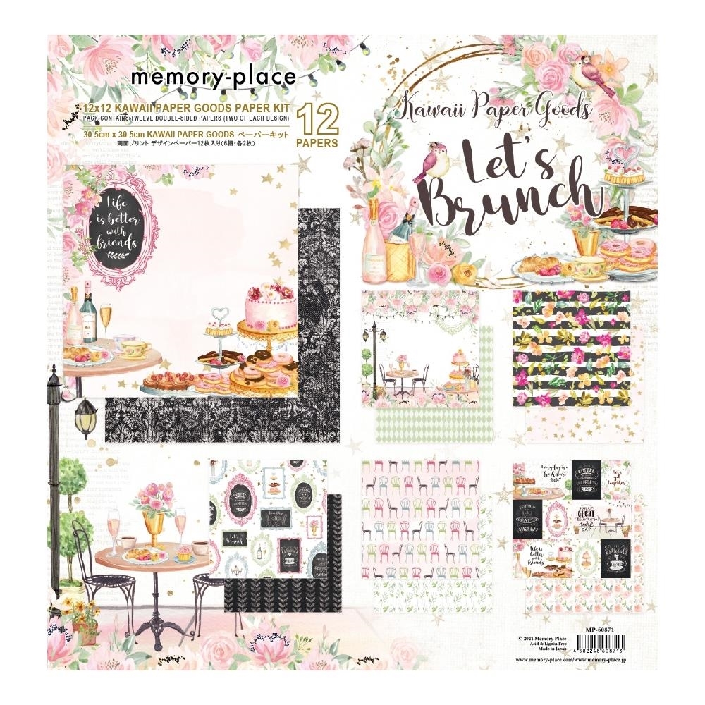 12 φύλλα scrapbooking διπλής όψης σε 6 διαφορετικά σχέδια (2 από το καθένα) από τη συλλογή Let's Brunch της Memory Place. Εικόνες με κρουασάν, γλυκά, τούρτες, λουλούδια και άλλα