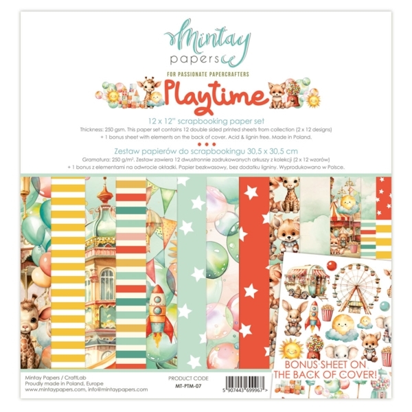 Πολύχρωμη, χαρούμενη, γεμάτη με απίθανα πλάσματα βγαλμένα κατευθείαν μέσα από λούνα πάρκ - η συλλογή Playtime της Mintay Papers είναι ιδανική για να δημιουργήσετε οποιοδήποτε project για μωρό ή μικρό παιδί.