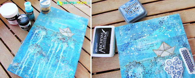 Χρησιμοποίησα χρώματα λαδιού για να τονίσω τα ανάγλυφα στοιχεία.Έφτιαξα ένα καραβάκι από σελίδα βιβλίου και το κόλλησα με mod podge. Έκοψα στη μέση μεταλλικούς διακοσμητικούς κύκλους και τα κόλλησα για κύματα.