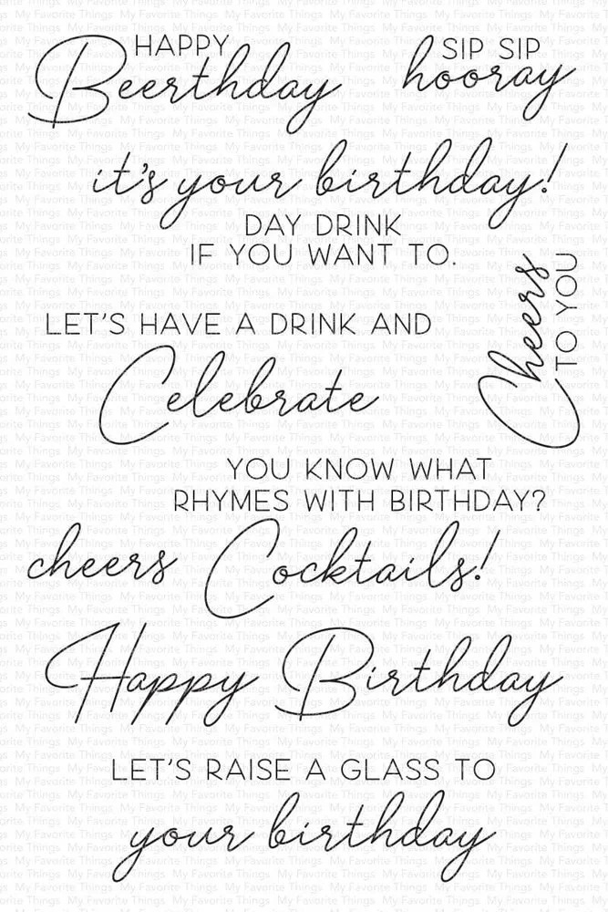 👉H συσκευασία περιλαμβάνει 14 διάφανες σφραγίδες με sentiments που έχουν θέμα τα γενέθλια όπως Happy beerthday, Let's have a drink and celebrate, sip sip hooray, it's your birthday Day Drink if you want to και άλλα.