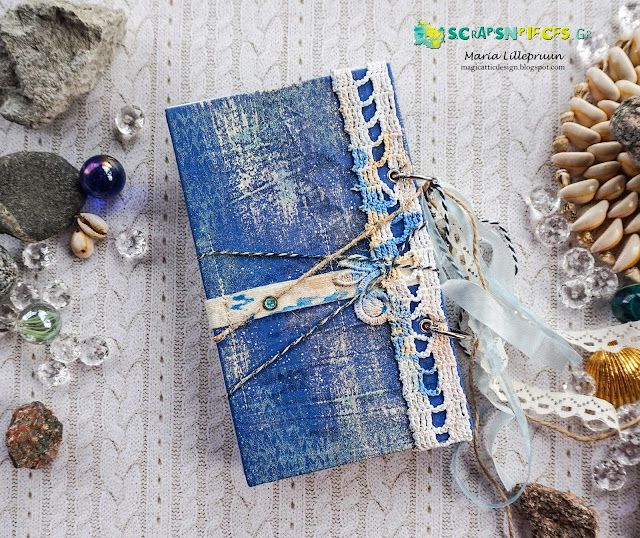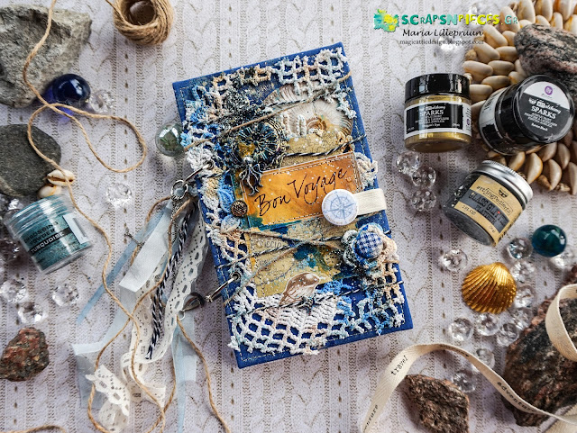 I also used a variety of embellishments and twines. I added some color to the cover using Finnabair´s Art Alchemy Opal Magic Paint, blue and brown acrylic paints.