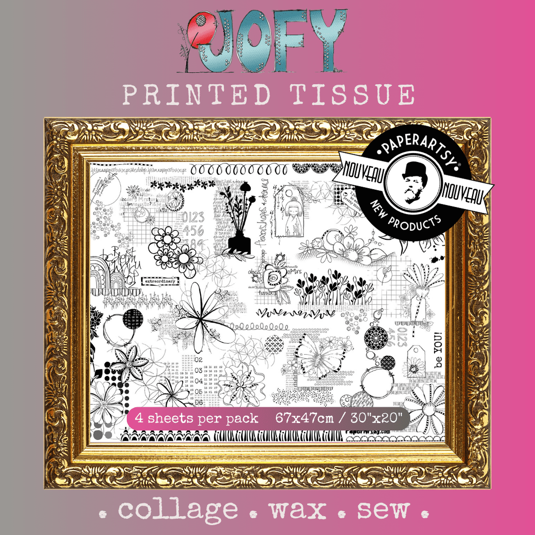 Το JoFY Printed Tissue PT03 της PaperArtsy είναι ριζόχαρτο με τα παιχνιδιάρικα, whimsical σχέδια της designer JoFY. Τα σχέδια βασίζονται σε στοιχεία από τη συλλογή σφραγίδων και stencil της JoFY και έχουν τυπωθεί σε διαφορετικές κλίμακες και συνδυασμούς, ώστε να λειτουργούν τέλεια σε collage και mixed media επιφάνειες.