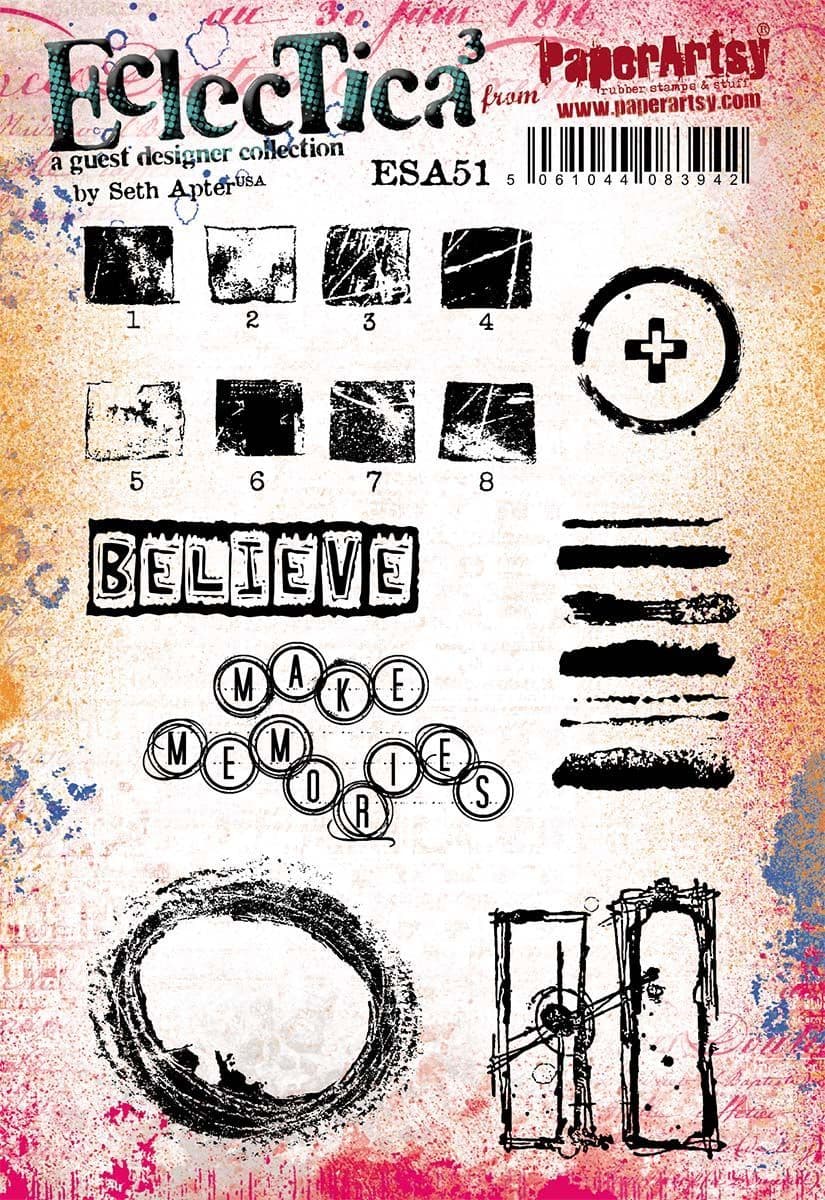 Το Eclectica³ ESA51 της PaperArtsy, σχεδιασμένο από τον Seth Apter, συνδυάζει words, numbers και δυνατά abstract marks σε ένα σετ που είναι φτιαγμένο για layering.