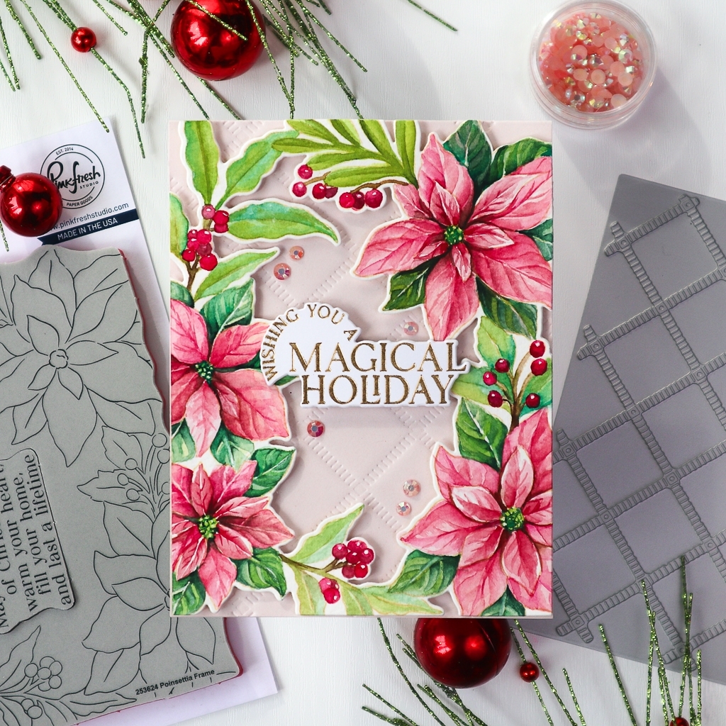 Σετ με 7 layering στένσιλ από τη συλλογή Poinsettia Frame της Pinkfresh Studio. Χρησιμοποιήστε τα για να δημιουργήσετε ένα πολυ-επίπεδο χριστουγεννιάτικο στεφάνι με αλεξανδρινά.