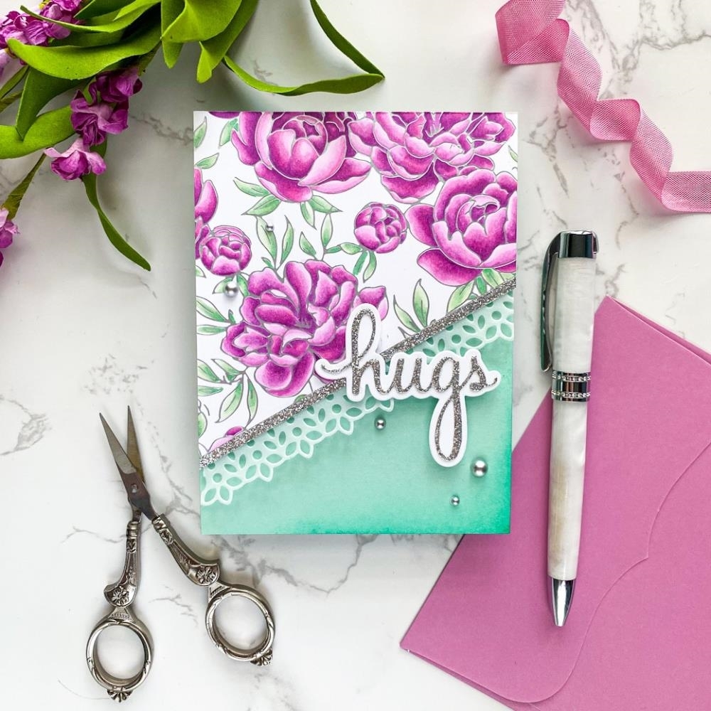Σετ με 2 layering στένσιλ της Pinkfresh Studio. Χρησιμοποιήστε τα για να δημιουργήσετε μια πολυ-επίπεδη εικόνα με παιώνιες.