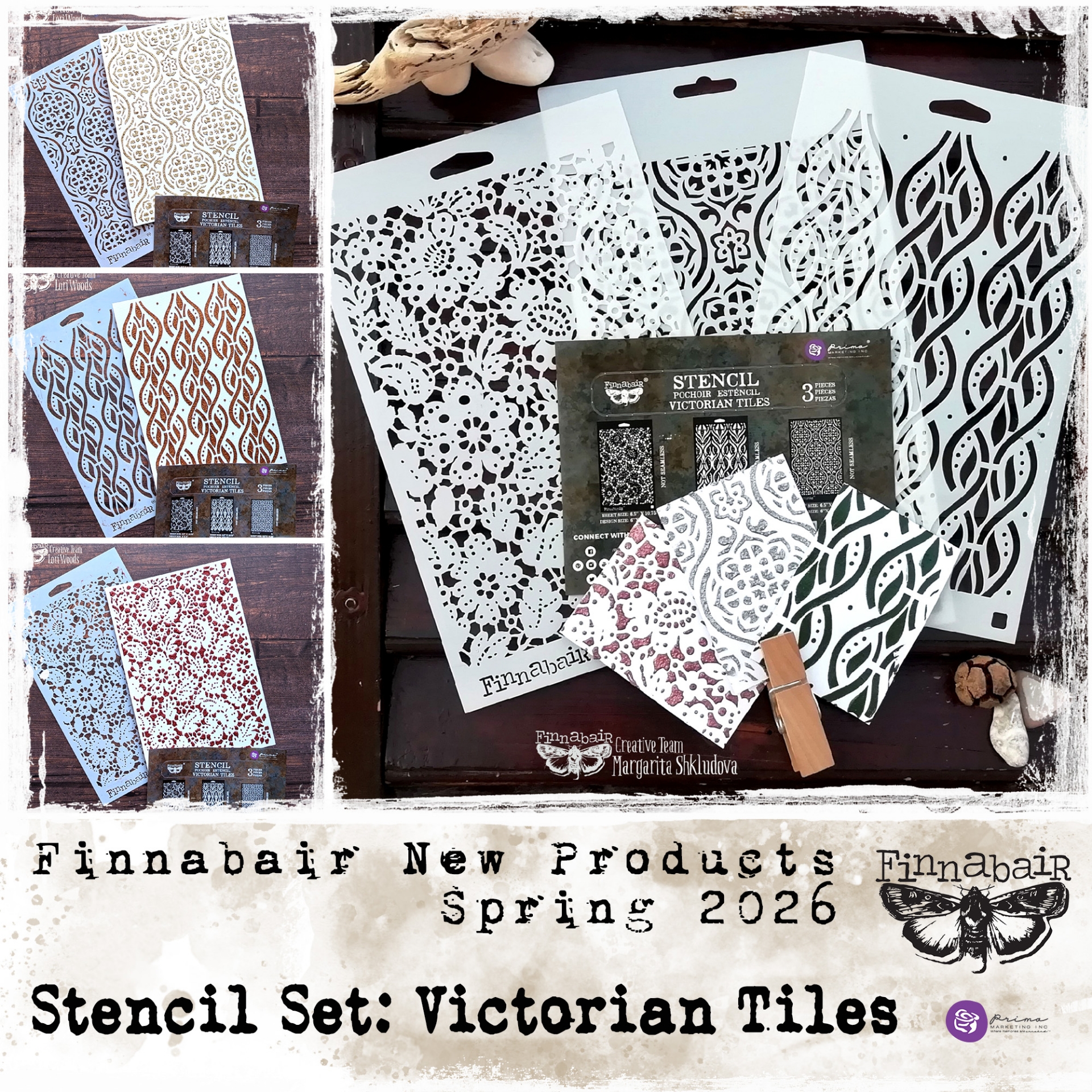 Το Victorian Tiles από τη σειρά Finnabair Limited Edition της Prima Marketing είναι ένα σετ με 3 stencils 6" x 9", σχεδιασμένο για έργα που θέλουν πλούσιο μοτίβο, υφή και διακοσμητική ένταση. Το σετ περιλαμβάνει τρία σχέδια: ένα πιο πυκνό floral μοτίβο με αίσθηση δαντέλας και δύο επαναλαμβανόμενα διακοσμητικά patterns με πιο ρυθμική, επιμήκη φόρμα.