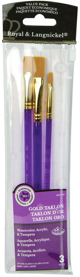 Το Royal & Langnickel Gold Taklon Value Pack RSET-9134 είναι ένα σετ αφιερωμένο στα πινέλα wash, δηλαδή σε πινέλα που βολεύουν περισσότερο σε πιο πλατιά περάσματα και σε εφαρμογές όπου θέλεις να καλύψεις επιφάνεια με πιο ομοιόμορφο τρόπο. Τα wash πινέλα είναι πολύ χρήσιμα για φόντα, glaze εφαρμογές, αραιωμένο χρώμα, κόλλες, βερνίκια και γενικά για δουλειές όπου χρειάζεσαι πιο φαρδιά πινελιά και σταθερή κατανομή του υλικού. Η διαβάθμιση στα μεγέθη 1/4", 3/8" και 5/8" το κάνει πρακτικό τόσο για πιο μικρές περιοχές όσο και για μεγαλύτερα περάσματα μέσα στην ίδια σύνθεση.
