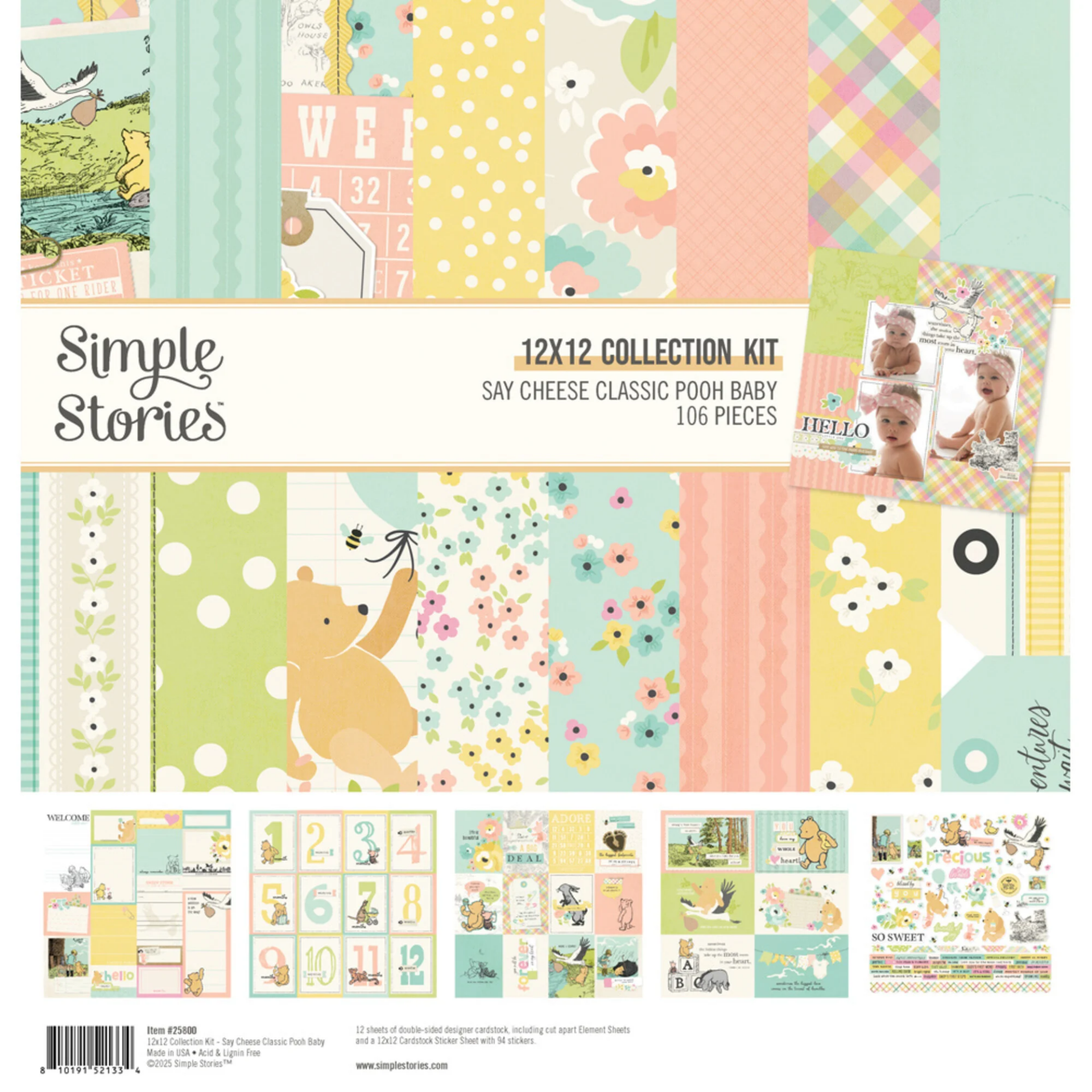 Το Collection Kit της συλλογής Say Cheese Classic Pooh Baby περιλαμβάνει όλα τα βασικά στοιχεία που χρειάζεσαι για να ξεκινήσεις ένα baby scrapbooking project με συνοχή και κομψότητα.
