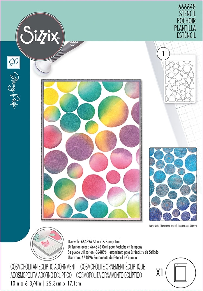 Στένσιλ με κυκλικά μοτίβα από την Stacey Park και την Sizzix. Το στένσιλ δείχνει εξίσου εντυπωσιακό αν χρησιμοποιηθεί ως φόντο, για να προσθέσει διάσταση σε συνδυασμό με άλλα elements, ακόμα και ως κεντρικό θέμα στα έργα σας!