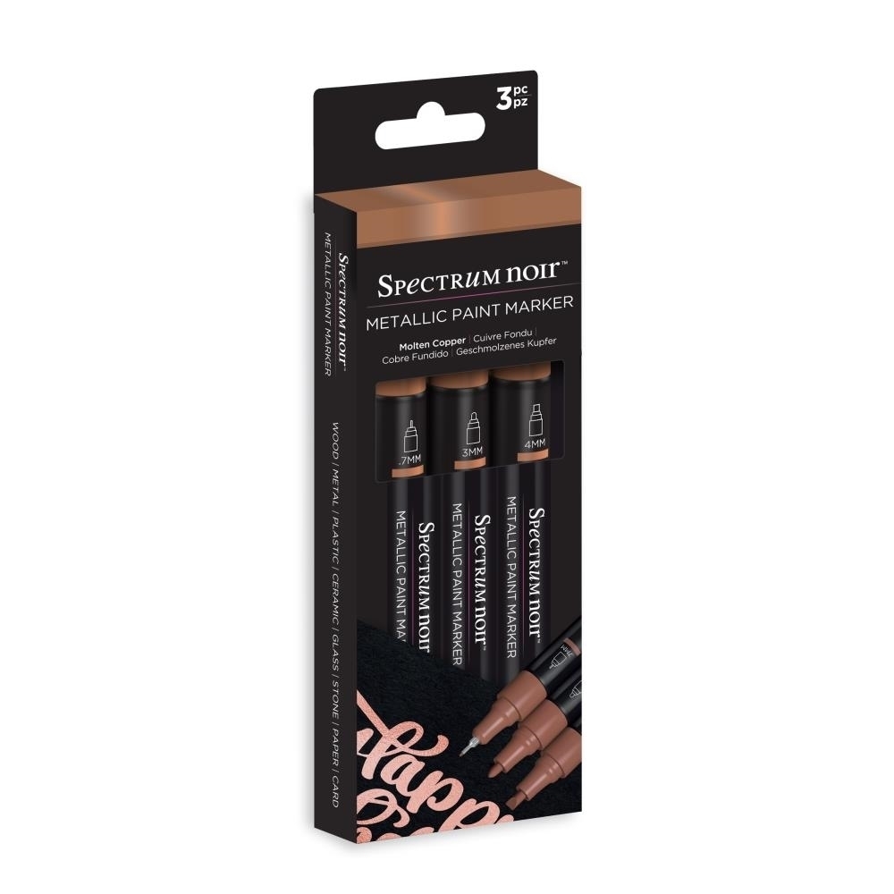 Μεταλλικοί μαρκαδόροι από την Spectrum Noir με πρωτοποριακό μελάνι με βάση το λάδι. Δίνουν πλούσια, αδιαφανή μεταλλικά χρώματα με έντονη λάμψη και είναι ιδανικοί για έργα home decor ή mixed media. Κάθε σετ περιλαμβάνει 3 μαρκαδόρους του ίδιου χρώματος με διαφορετικές μύτες, για γραφή, λεπτομέρειες ή ζωγραφική. Αποδίδουν καλύτερα σε σκουρόχρωμες επιφάνειες όπου οι ιδιότητες τους τους κάνουν πραγματικά να ξεχωρίσουν!