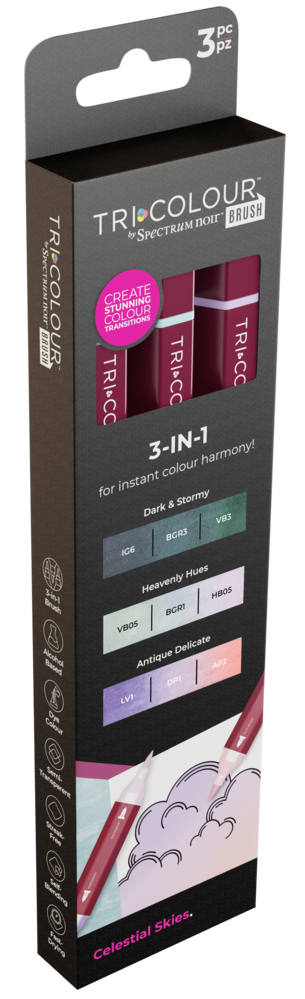 Το σετ Celestial Skies περιλαμβάνει 3 μαρκαδόρους 3 σε 1 για να «αιχμαλωτίσετε» τη μαγεία του ουρανού που εναλλάσσεται διαρκώς καθώς προχωρά η μέρα! Κάθε μαρκαδόρος 3 σε 1 έχει μύτη ιαπωνικού τύπου που σας επιτρέπει να δημιουργείτε εντυπωσιακές χρωματικές αποχρώσεις. Η εναλλαγή από το ένα χρώμα στο επόμενο γίνεται αβίαστα ενώ η συσκευασία είναι ιδανική για να ζωγραφίζετε παντού και κάθε στιγμή! Γιατί με τρεις μαρκαδόρους έχετε στην πραγματικότητα εννέα! Η σειρά απευθύνεται σε όλους, τόσο στους αρχάριους όσο και στους έμπειρους καλλιτέχνες!