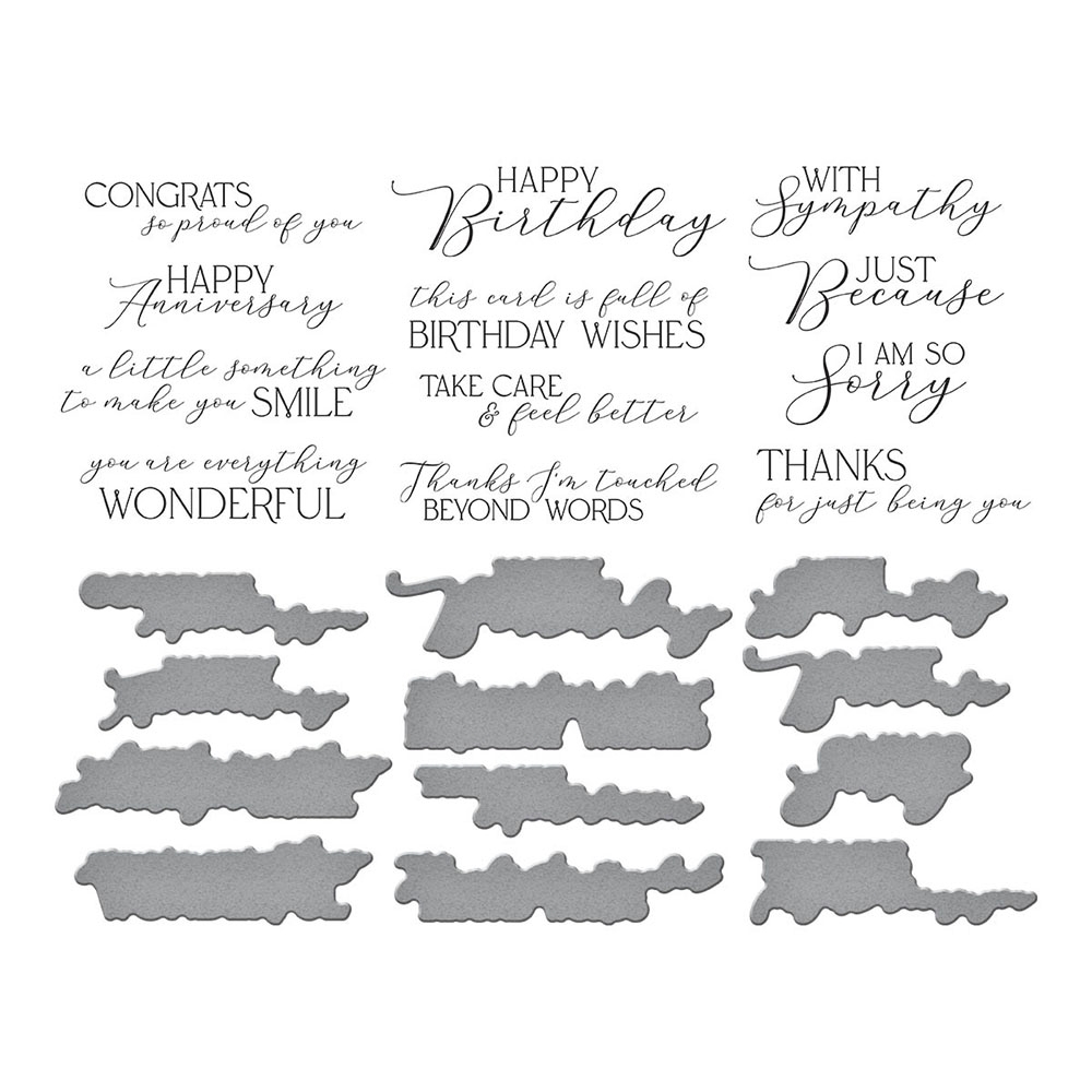 👉 Η συσκευασία περιέχει 6 press plates με sentiments όπως Happy Birthday, Take Care & Feel Better, Thanks for just being you και 6 μήτρες κοπής με το αντίστοιχο περίγραμμά τους.