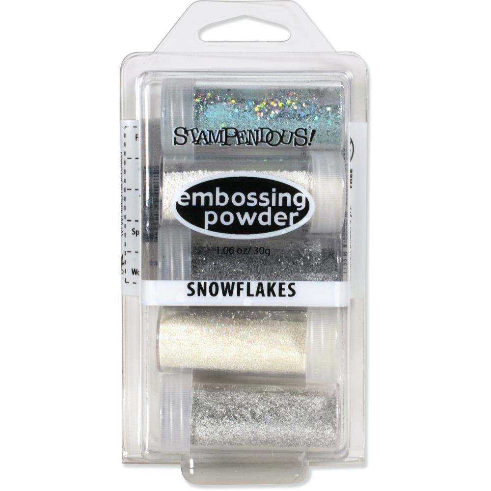 Το Snowflakes Embossing Powder Kit της Stampendous είναι φτιαγμένο για χειμώνα: σου δίνει επιλογές για παγωμένο γυάλισμα, χιόνι, ασημί tinsel και ανάγλυφο “puff” σε ένα σετ, ώστε να χτίζεις σκηνές και φόντα χωρίς να ψάχνεις “τι να ταιριάξω με τι”.