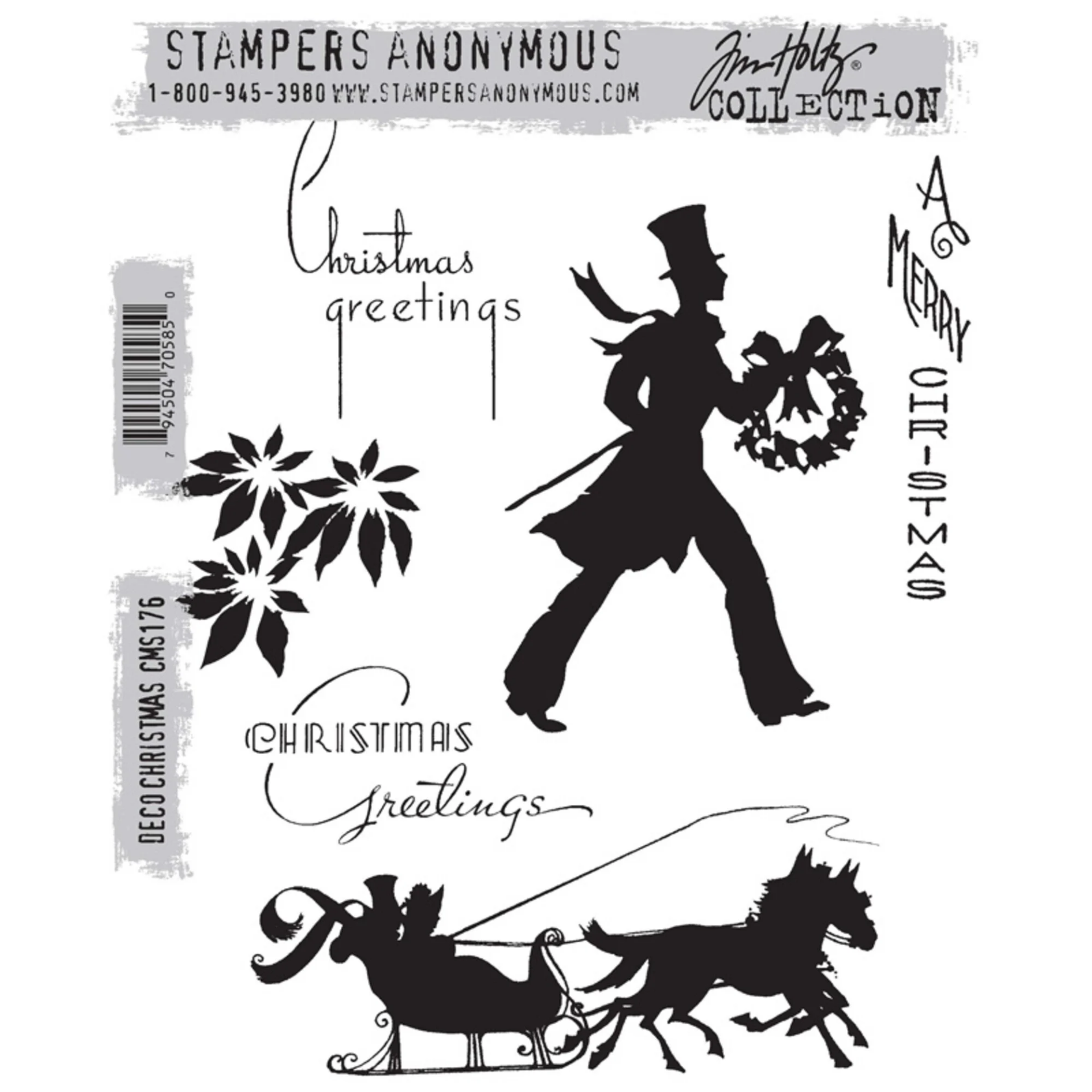 Η συλλογή “Deco Christmas” της Stampers Anonymous, σχεδιασμένη από τον Tim Holtz, αποτυπώνει το πνεύμα των Χριστουγέννων μέσα από σιλουέτες και minimal γραμμές εμπνευσμένες από την art deco εποχή. Το σετ περιλαμβάνει τρεις φιγούρες – έναν gentleman με στεφάνι, τον Άγιο Βασίλη με έλκηθρο και μια εορταστική σιλουέτα με στεφάνι – καθώς και τρία χριστουγεννιάτικα μηνύματα (“A Merry Christmas”, “Peace on Earth”, “Season’s Greetings”).