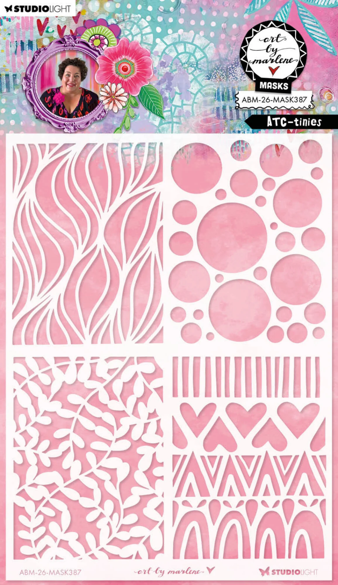 Το ATC-Tinies Mask της Art by Marlene σου δίνει τέσσερα ξεχωριστά σχέδια σε μέγεθος ATC μέσα σε ένα στένσιλ. Είναι σχεδιασμένο για να δουλεύει τέλεια σε μικρή κλίμακα, χωρίς να χάνεται η λεπτομέρεια.