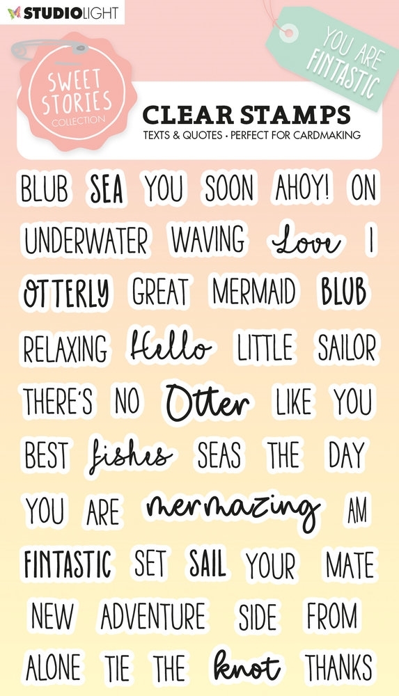 👉 Η συσκευασία περιέχει 46 διάφανες σφραγίδες με φράσεις όπως "blub", "sea", "you", "soon", "ahoy!", "on", "underwater", "waving", "love", "I", "otterly", "great", "mermaid", "blue", "relaxing", "hello", "little", "sailor", και άλλες πολλές ώστε να συνθέσετε το προσωπικό σας μήνυμα.