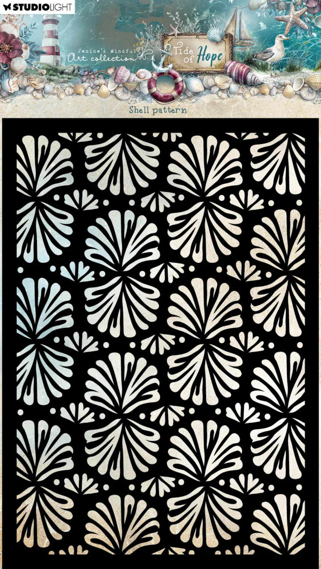 Το σχέδιο με τα κοχύλια είναι απόλυτα δεμένο με τη θαλασσινή αισθητική της συλλογής Tide of Hope και δουλεύει όμορφα είτε σαν διακριτικό background είτε σαν πιο έντονο στοιχείο σε μια σύνθεση. Μπορείς να το χρησιμοποιήσεις με μελάνια για απαλά εφέ, με ακρυλικά για πιο έντονο αποτέλεσμα ή με πάστες για να δώσεις όγκο και υφή.