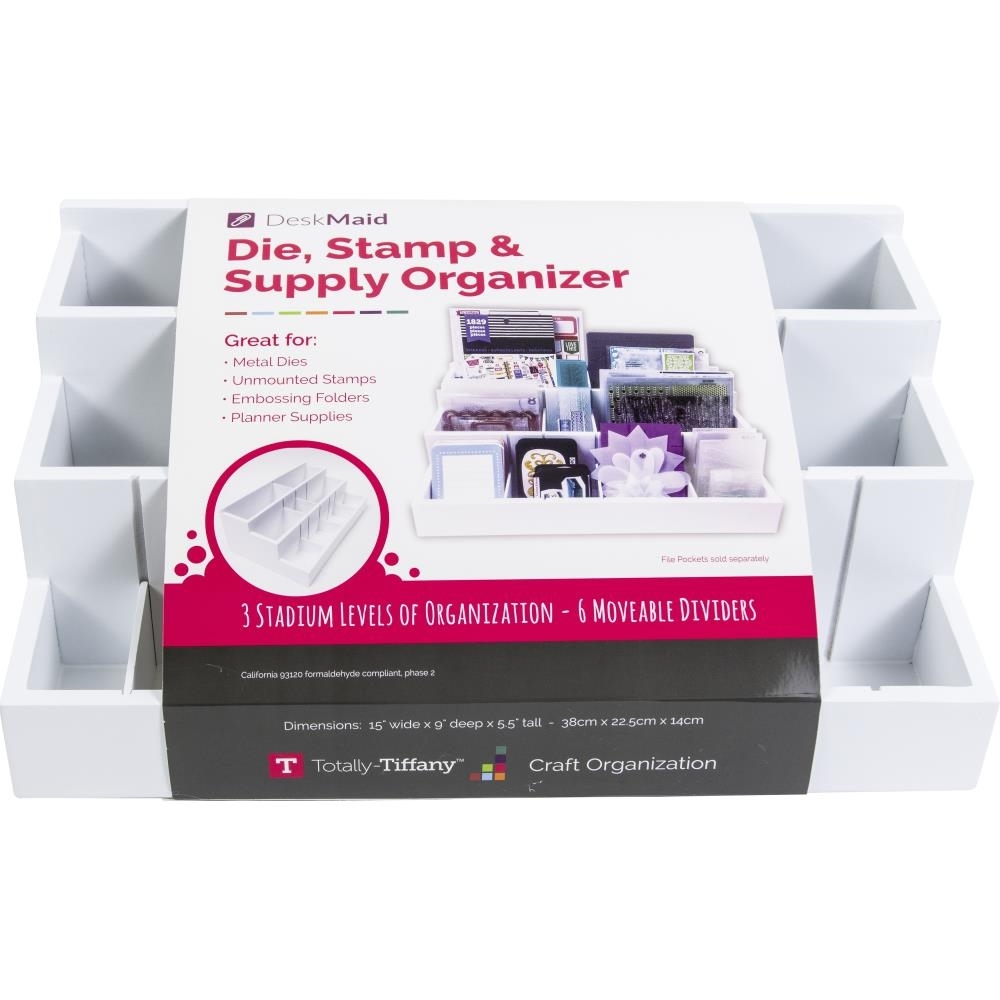 Ιδανικό για σφραγίδες, dies, embossing folders, planner supplies και πολλά άλλα! Με τρία επίπεδα και έξι διαχωριστικά που μπορείτε να τα ρυθμίσετε για να βλέπετε τα πάντα και να είναι όλα δίπλα στο χέρι όποτε τα χρειάζεστε. Φτιαγμένο από μασίφ ξύλο και βαμμένο λαμπερό άσπρο.