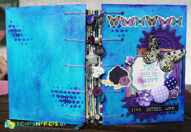 Χρησιμοποιώντας λοιπόν κυρίως τα μωβ και μπλε/τυρκουάζ χρώματα της πρόκλησης, δημιούργησα αυτό το παιχνιδιάρικο βιβλιαράκι με διαστάσεις 5 x 7 ίντσες ( 12,7 x 17,8 cm).