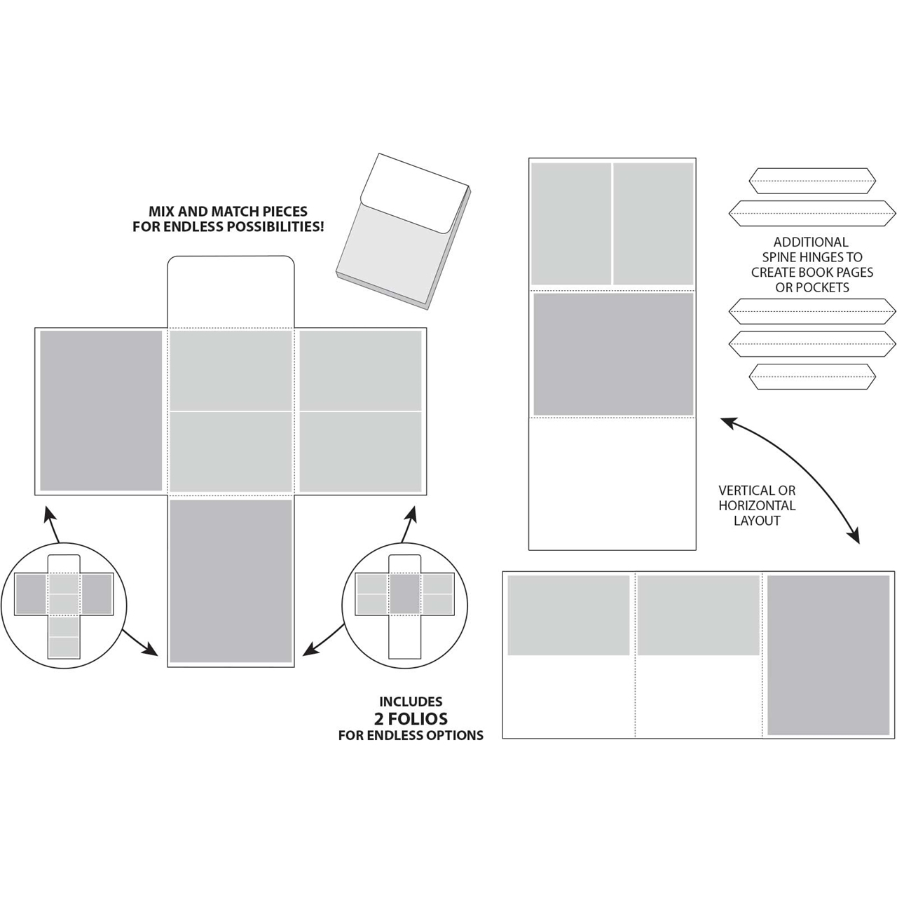 Στη συσκευασία θα βρείτε δύο folios, δύο σελίδες πορτρέτου 6'' x 8'', δύο οριζόντιες σελίδες 8" x 6'', τέσσερις photo mat σελίδες 4" x 6", τέσσερις οριζόντιες σελίδες για φωτογραφίες 6" x 4", δύο μικρές ενώσεις ράχης 6,25" και τρεις μεγάλες ενώσεις ράχης 8.25" (spine hinges) για να τα δέσετε με τον τρόπο που θα γυρνάνε οι σελίδες.