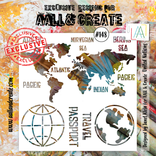 👉 Η συσκευασία περιέχει ένα στένσιλ που απεικονίζει έναν παγκόσμιο χάρτη, με τις θάλασσες και τους ωκεανούς, υδρόγειους και τις λέξεις "Travel" και "Passport".