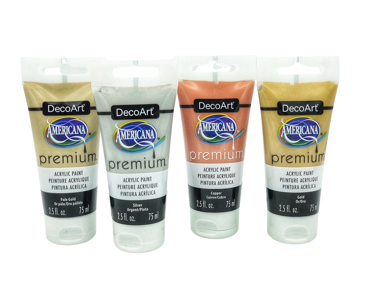 H συσκευασία περιλαμβάνει 4 χρώματα σε σωληνάριο 2.5oz (75 ml): Pale Gold, Silver, Copper, Gold.