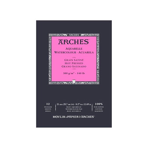 Μπλοκ με 12 φύλλα χαρτί Arches 300gsm (140lb) 100% βαμβάκι. Είναι hot pressed, δηλ έχει λεία επιφάνεια. Ιδανικό για ακουαρέλα και άλλα υγρά μέσα, αλλά και πολύ καλή επιφάνεια για σκίτσο με πένα, μαρκαδοράκι, μολύβι κλπ.